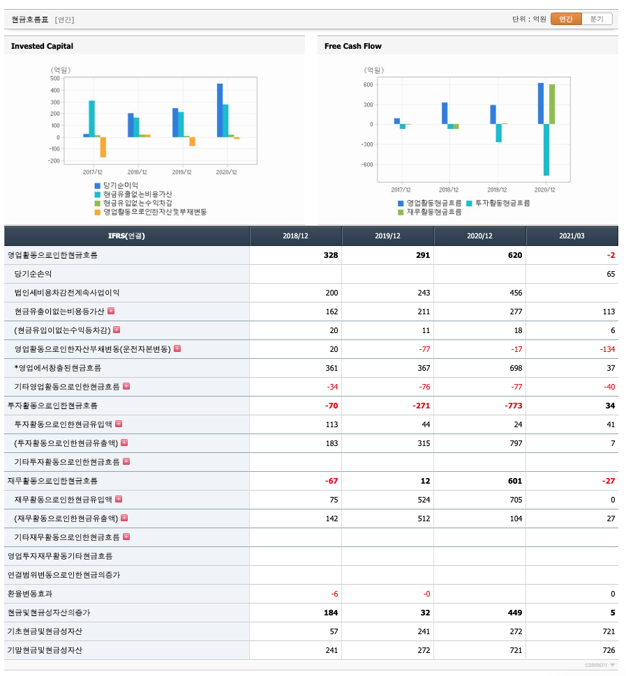 영업활동 현금흐름 : 2018년 328억원, 2019년 291억원, 2020년 620억원, 2021년 1분기 -2억원으로 2018년~2020년의 영업활동 현금흐름은 원활하였고, 2021년 1분기의 영업활동 현금흐름은 원활하지 못했습니다.