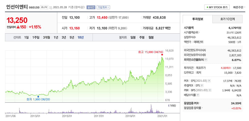 | 인선이엔티 | 13250원 | 13433원 | 13327원 | 13546원 |