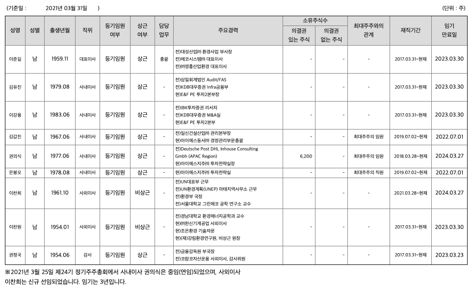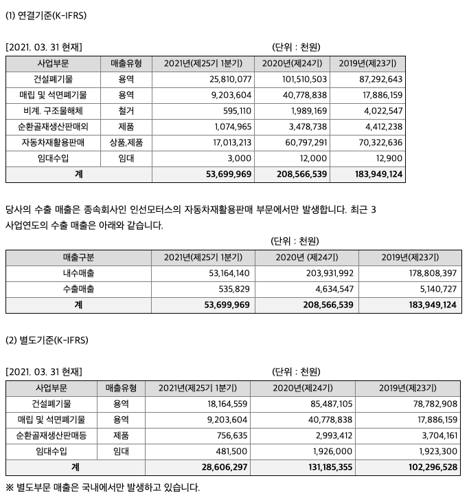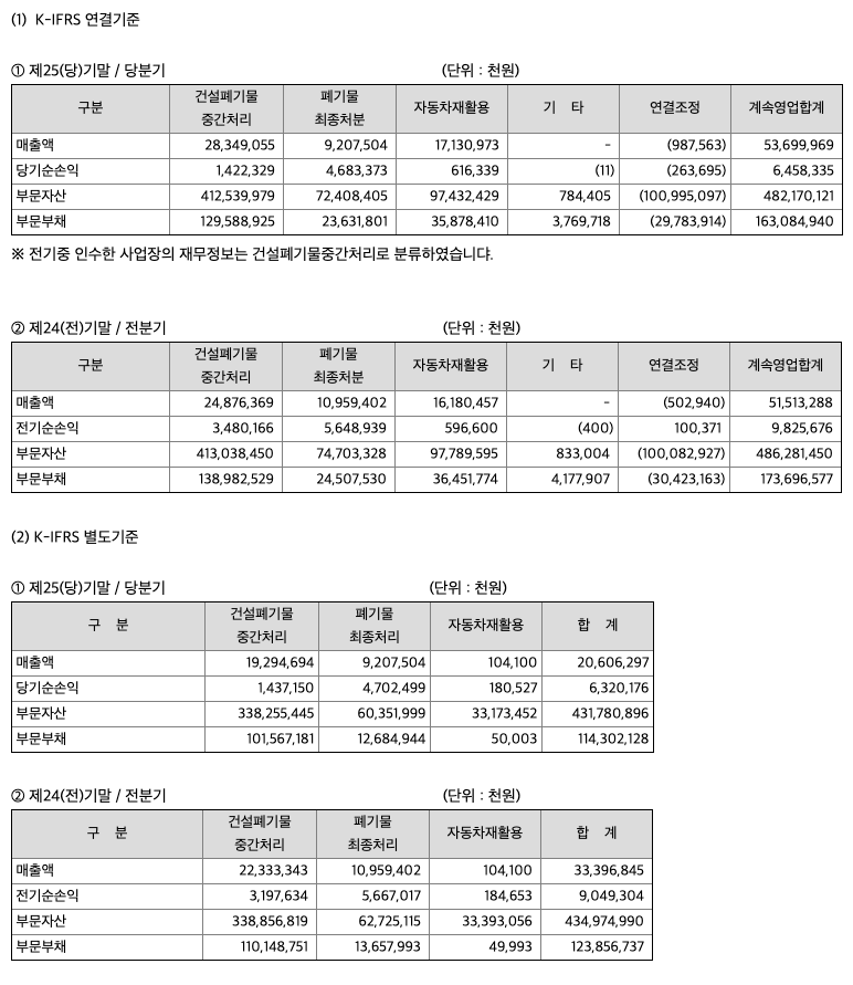 당사는 건설폐기물 수집ㆍ운반 및 중간처리, 폐기물 최종처분사업, 자동차 해체재활용 사업, 자동차 파쇄재활용사업 등 친환경 자원 재활용(Recycling) 및 처리사업을 영위하는 환경친화적기업입니다. 건설폐기물 분야 국내 기업 중 유일하게 비계구조물 해체에서부터 건설폐기물의 수집ㆍ운반 및 중간처리, 순환골재 생산, 소각 및 스팀판매, 폐기물의 최종처분(매립)까지 폐기물 일괄처리 기술 및 특허를 보유하고 있습니다. 이러한 폐기물 재활용 및 처리사업 인프라를 기반으로 자동차재활용 사업에 진출하여 사업의 효율성 및 수익적 기대 가치를 높이고, 기업의 사회적 책임을 실천하는 최고의 환경 기업으로 발돋움 하고 있습니다.