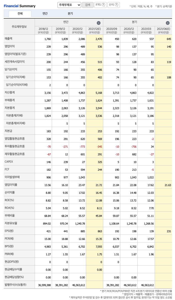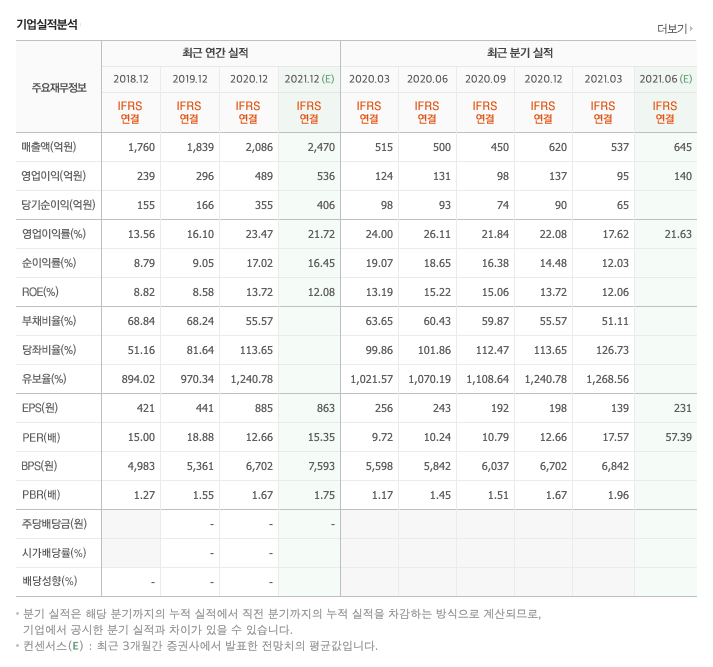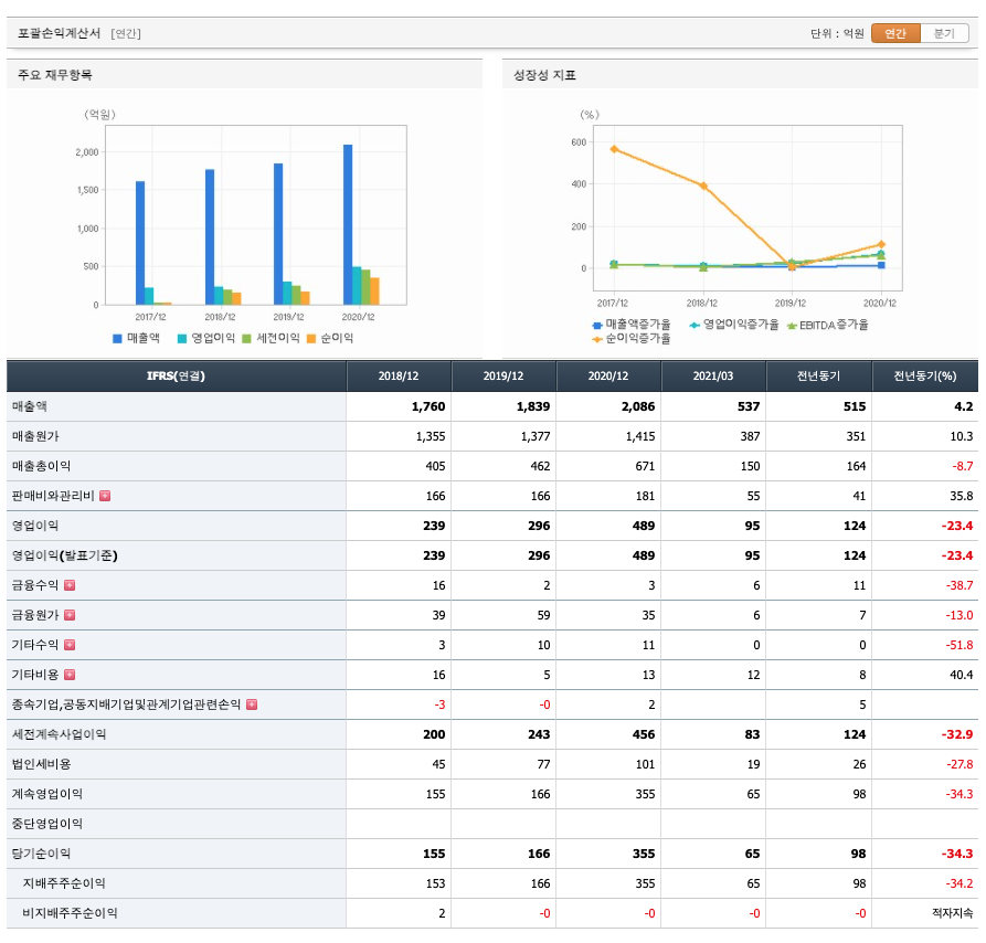 매출액 : 2018년 1760억원, 2019년 1839억원, 2020년 2086억원, 2021년 1분기 537억원으로 증가하였습니다. 2021년 1분기는 전년동기대비 4.2% 증가하였습니다. 2020년 분기별로 보면 2분기 500억원, 3분기 450억원, 4분기 620억원입니다.