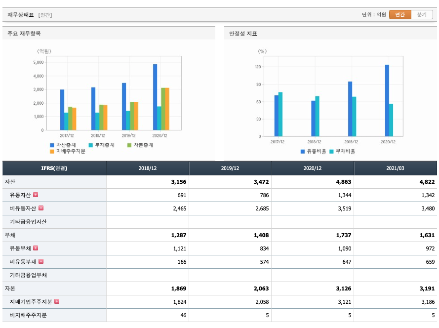 자산은 2018년 3156억원, 2019년 3472억원, 2020년 4863억원으로 증가하였고, 2021년 1분기 4822억원으로 감소하였습니다.