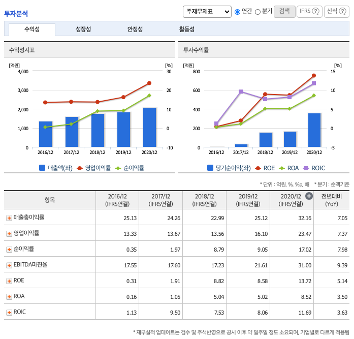 CAPEX(Capital expenditures,자본적 지출,미래의 이윤을 창출하기 위해 지출한 비용을 말함) : 2018년 146억원, 2019년 239억원, 2020년 27억원으로 CAPEX가 좋습니다. 2021년은 325억원으로 추정됩니다.