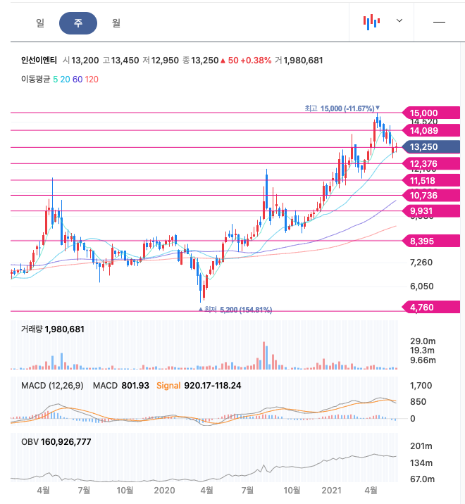 인선이엔티는 20년 11월부터 반등하여 지속적으로 우상향하였고, 21년 4월에 최고점 15,000원을 찍고 조정을 받았습니다.