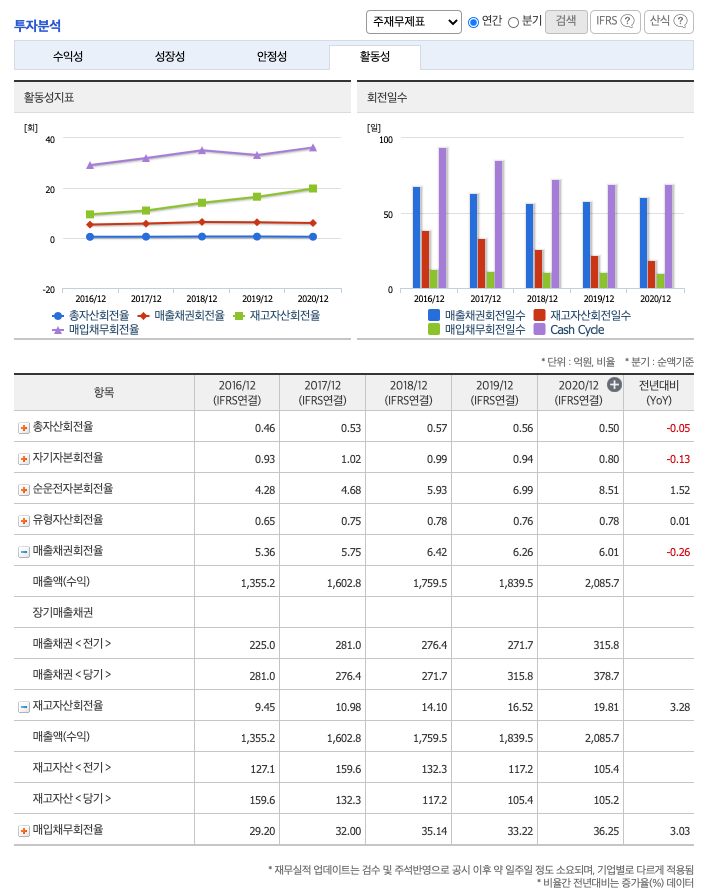 재고자산회전율 : 2018년 약 117억원, 2019년 약 105억원, 2020년 약 105억원이고, 회전율은 2018년 약 14회, 2019년 약 16회, 2020년 약 19회로 안정적입니다.