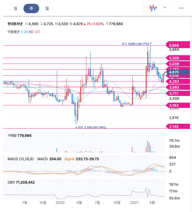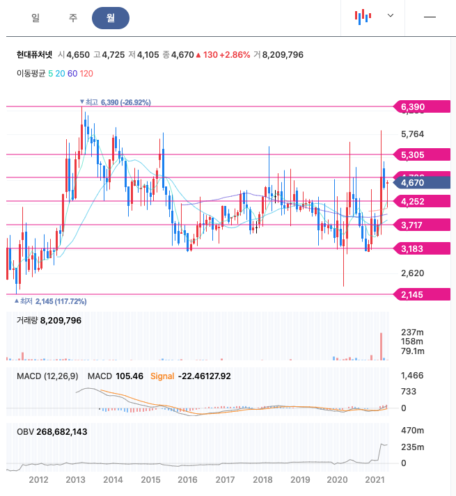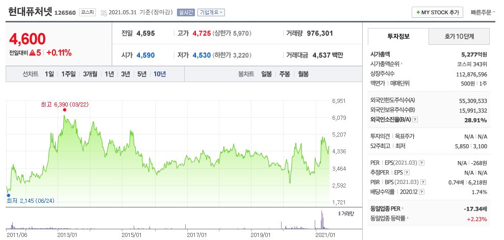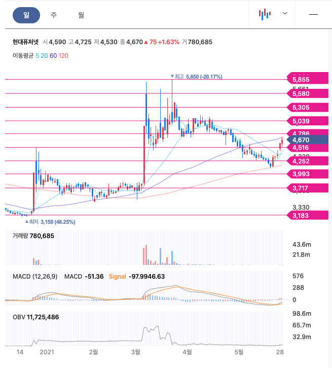 | 현대퓨처넷 | 4600원 | 5075원 | 4860원 | 4617원 |