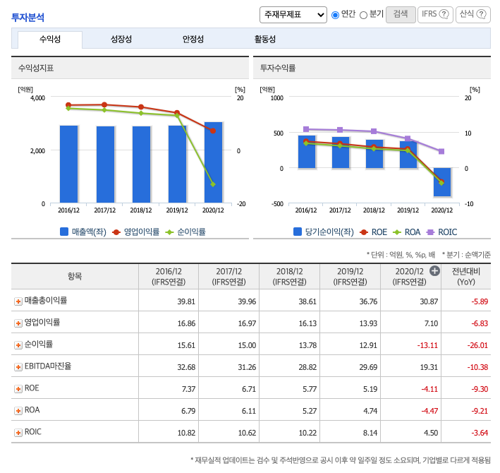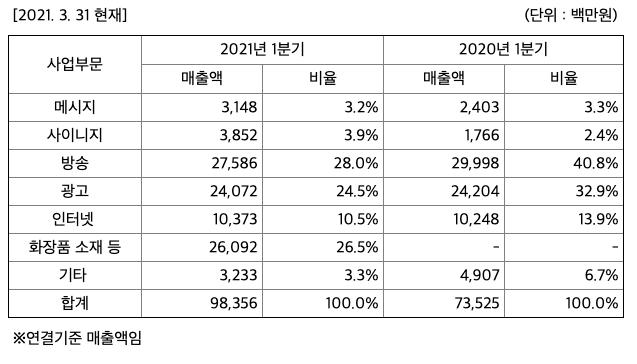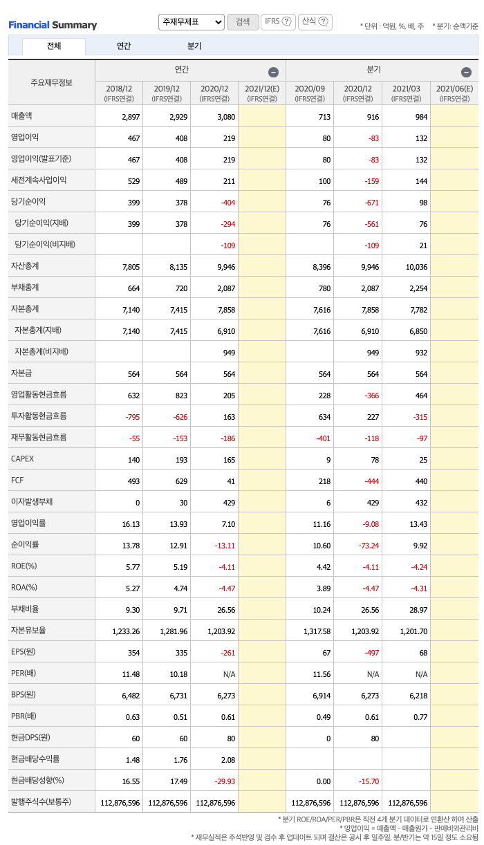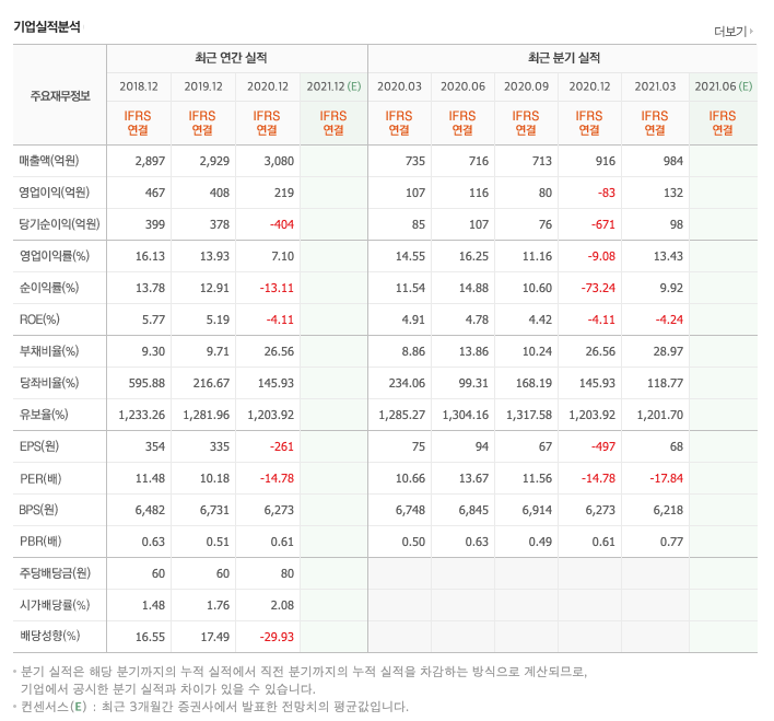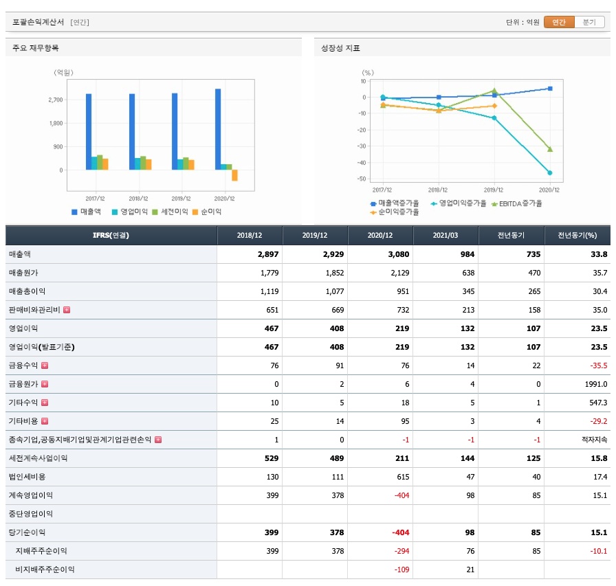 매출액 : 2018년 2897억원, 2019년 2929억원, 2020년 3080억원, 2021년 1분기 984억원으로 전년동기대비 증가하였습니다. 2021년 1분기는 전년동기대비 33.8% 증가하였습니다. 2020년 분기별로 보면 2분기 716억원, 3분기 713억원, 4분기 916억원입니다.