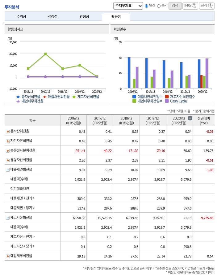 재고자산회전율 : 2018년 약 0.6억원, 2019년 약 0억원, 2020년 약 290억원이고, 회전율은 2018년 약 6919회, 2019년 약 9757회, 2020년 약 21회로 회전율이 급감하였습니다.