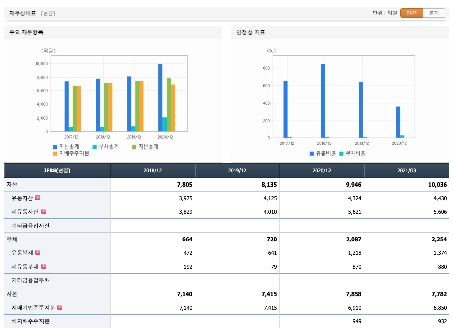 투자활동 현금흐름 : 2018년 -795억원, 2019년 -626억원, 2020년 163억원, 2021년 1분기 -315억원으로 2020년을 제외하고 투자활동 현금흐름이 원활합니다.