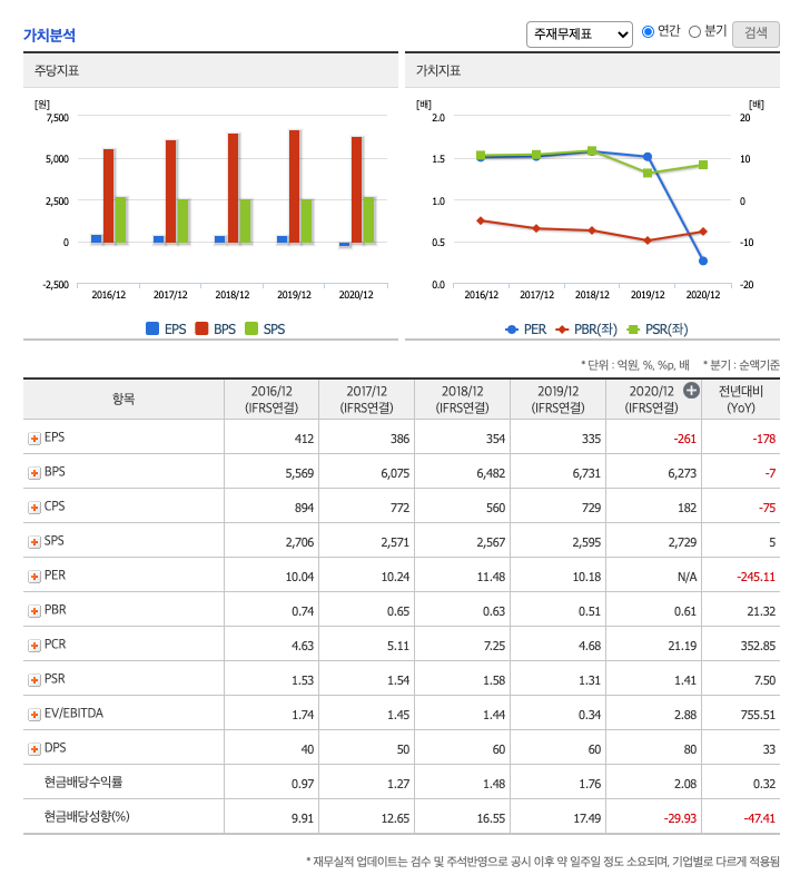 DPS(Dividend Per Share의 약자, 총배당금을 총주식발생수로 나눈 것, 한 주당 얼만큼의 배당금을 받을 수 있는지 알 수 있는 지표, DPS가 높을 수록 배당금이 많은 것임) : 2016년 40원, 2017년 50원, 2018년 60원, 2019년 60원, 2020년 80원으로 증가하였습니다.