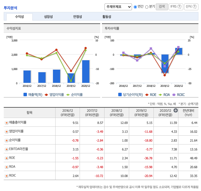 영업이익률 : 2016년 약 0.57억원, 2017년 약 -3.49억원, 2018년 약 3.13억원, 2019년 약 -11.68억원, 2020년 약 4.33억원으로 증가하였습니다.