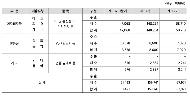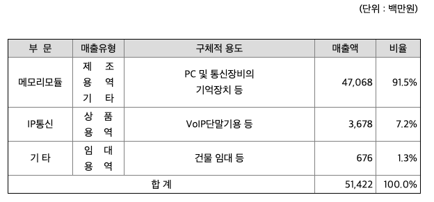 당사는 반도체 메모리 모듈 제조를 주 사업으로 영위하며 인터넷 관련기기 및 VoIP 장비(인터넷 전화기, VoIP 어댑터, 무선AP 등), 바이오 진단기기 관련사업도 수행하고 있습니다. 지배회사인 당사와 종속회사의 사업부문별 현황은 다음과 같습니다.
