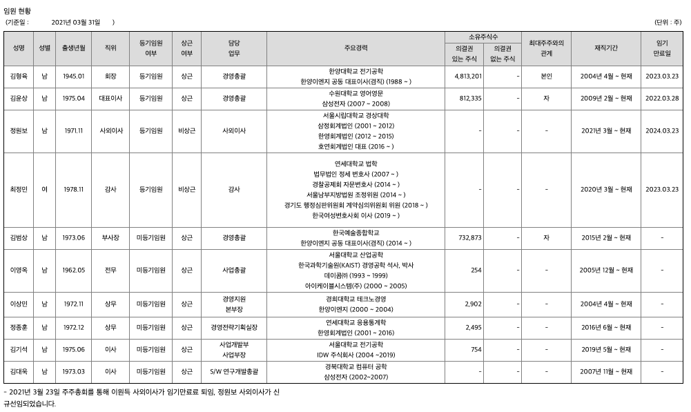 모바일 장치의 지배력이 강력하게 확장됨에 따라 모바일 부문에는 부품간의 시너지 극대화가 지속될 것으로 보입니다. 반면 기존 노트북과 데스크톱에 사용되던 D램 메모리모듈 사업은 안정적으로 사업을 영위할 것으로 보고 있습니다. 당사는 2018년부터 시작된 미중 무역분쟁에 대한 위험의 해결방안으로, 2019년 1월 베트남으로 생산기지를 이전하기 위하여 HANYANG DIGITECH VINA CO., LTD. 를 설립하였습니다. 현재 서버에 사용되는 특수 메모리모듈을 주력으로 양산하고 있으며, 노트북과 데스크톱에 사용되는 메모리모듈도 병행하여 양산하고 있습니다. 2020년은 코로나 바이러스 감염증-19(Covid-19)의 세계적 유행으로 원부자재 공급업체 생산중단, 운송경로 폐쇄 등 위기가 있었지만, 비대면 경제가 활성화 되면서 메모리모듈 수요가 증가하는 기회가 공존하였습니다. 2021년에도 메모리모듈 수요는 꾸준히 증가할 것으로 전망되며, 차세대 D램인 DDR5가 본격적으로 생산되면 꾸준한 성장을 이어갈 것으로 기대됩니다.