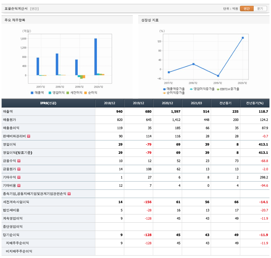 매출액 : 2018년 940억원, 2019년 680억원으로 감소하였고, 2020년 1597억원으로 증가하였고, 2021년 1분기 514억원으로 전년동기대비 증가하였습니다. 2021년 1분기는 전년동기대비 118.7% 증가하였습니다. 2020년 분기별로 보면 2분기 427억원, 3분기 461억원, 4분기 474억원입니다.