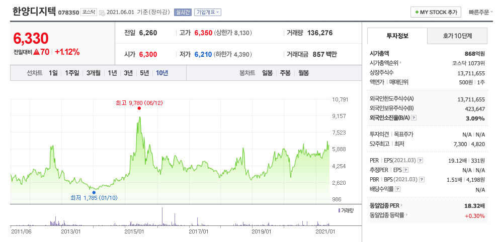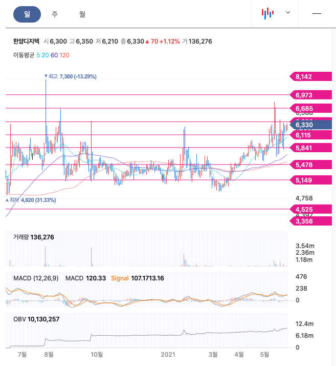 한양디지텍은 20년 5월에 급등하여 20년 7월에 최고점 7,300원을 찍고, 조정을 받은 뒤, 보합상태였다가, 21년 3월부터 우상향하고 있습니다.