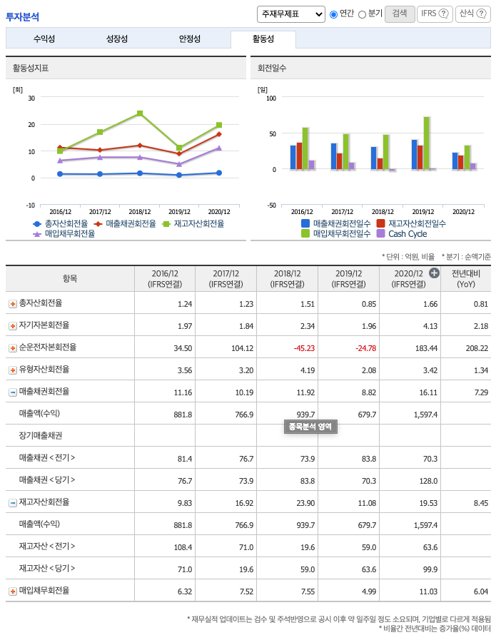 재고자산회전율 : 2018년 약 59억원, 2019년 약 63억원, 2020년 약 99억원이고, 회전율은 2018년 약 23회, 2019년 약 11회, 2020년 약 19회로 안정적입니다.