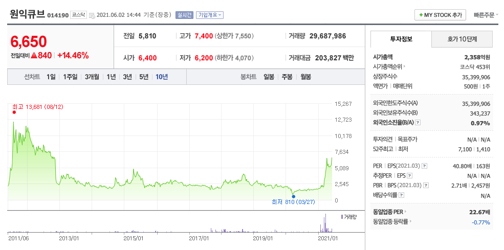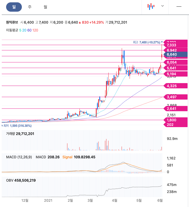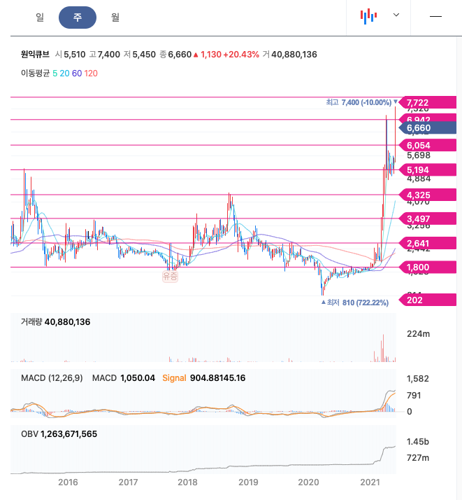 원익큐브는 21년 3월에 급등하여 21년 4월 최고 7,100원을 찍고 조정을 받았으며, 21년 6월 최고 7,400원을 찍었습니다.