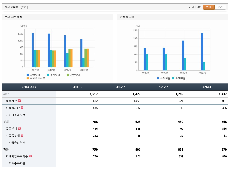 재무활동 현금흐름 : 2018년 38억원, 2019년 56억원, 2020년 169억원, 2021년 1분기 67억원으로 2018년과 2019년과 2021년 1분기의 재무활동 현금흐름은 플러스였고, 2020년 재무활동 현금흐름은 마이너스로 원활합니다.
