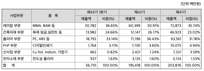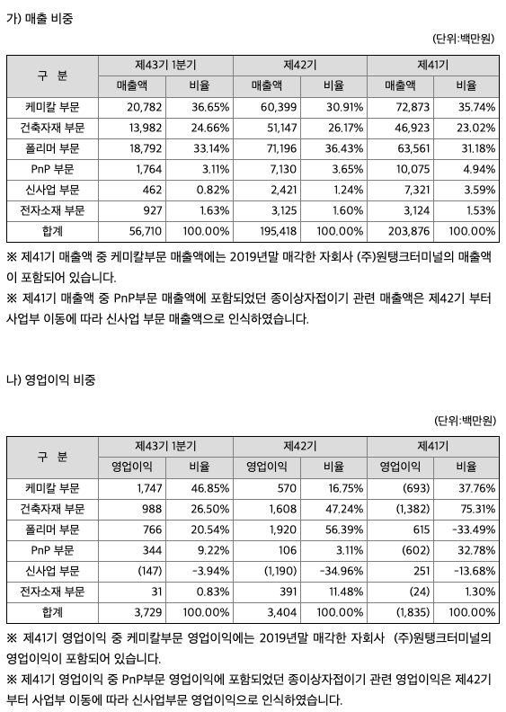 당사의 사업부문은 케미칼 부문, 건축자재 부문(건자재&실리콘), 폴리머 부문, PnP부문(Printing&Packing), 신사업부문, 자회사(나노이닉스) 전자소재 부문으로 구성되어 있습니다.