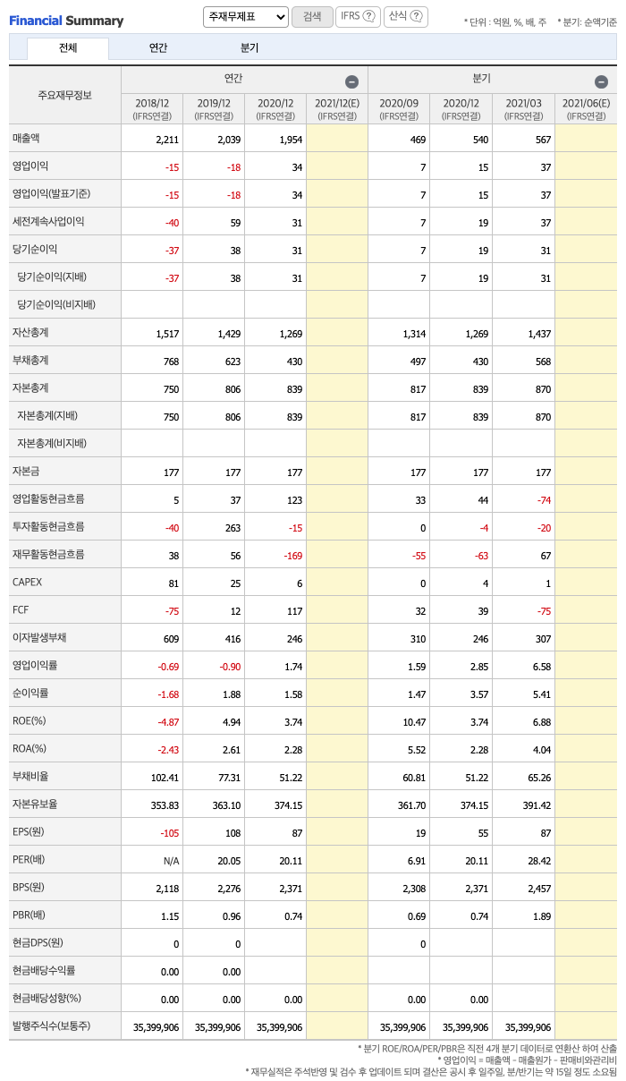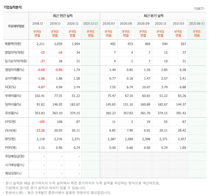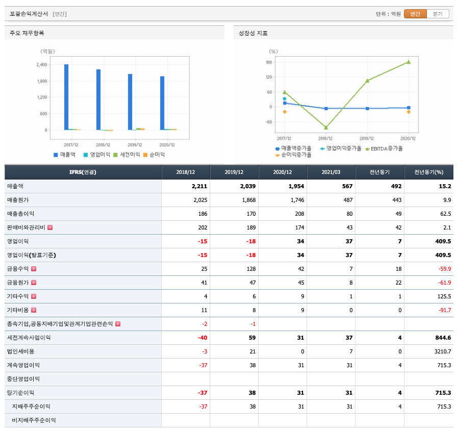 매출액 : 2018년 2211억원, 2019년 2039억원, 2020년 1954억원으로 감소하였고, 2021년 1분기 567억원으로 전년동기대비 증가하였습니다. 2021년 1분기는 전년동기대비 15.2% 증가하였습니다. 2020년 분기별로 보면 2분기 453억원, 3분기 469억원, 4분기 540억원입니다.