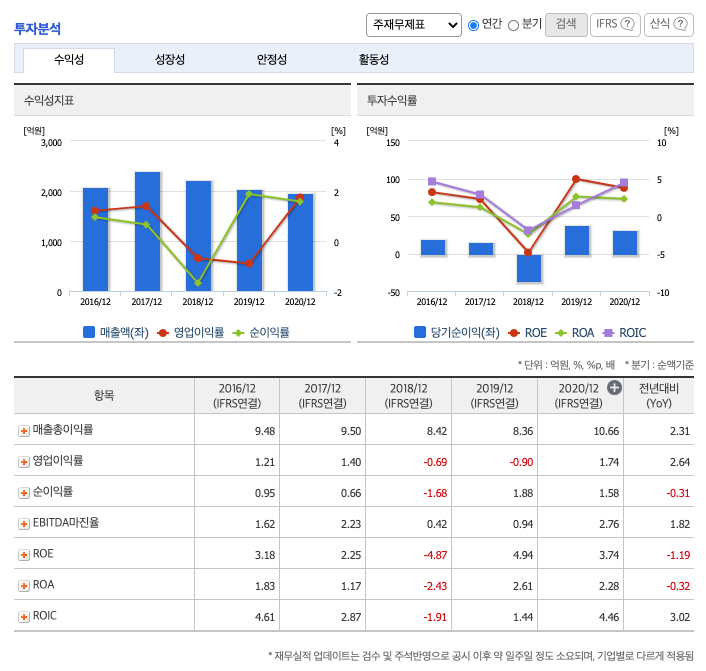 영업이익률 : 2016년 약 1.21억원, 2017년 약 1.4억원, 2018년 약 -0.69억원, 2019년 약 -0.9억원, 2020년 약 1.74억원으로 증가하였습니다.