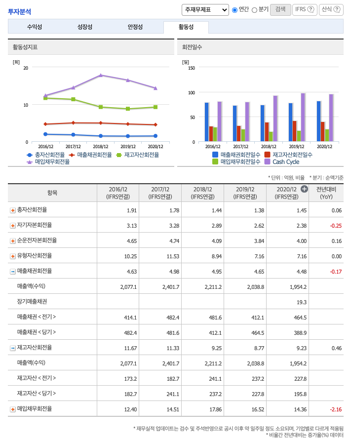매출채권회전율 : 2018년 약 412억원, 2019년 약 464억원, 2020년 약 388억원이고, 회전율은 2018년 약 4회, 2019년 약 4회, 2020년 약 4회로 안정적입니다.