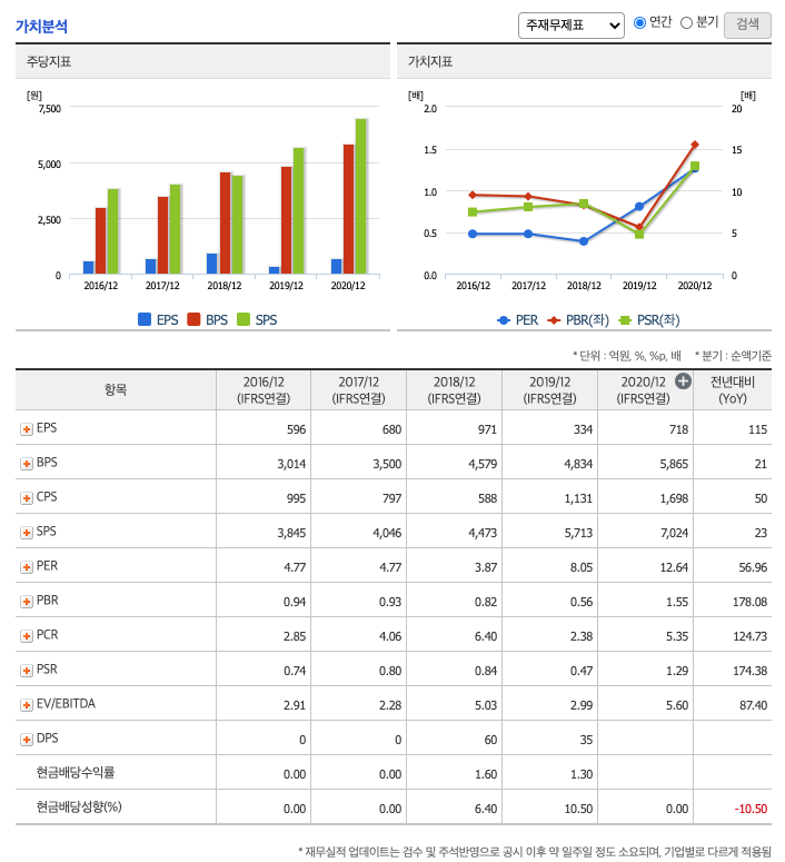 FCF(미래현금흐름) : 2018년 -2억원, 2019년 238억원, 2020년 446억원으로 2019년부터 미래현금흐름이 좋습니다.