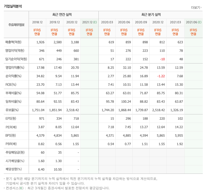 영업이익 : 2018년 346억원, 2019년 449억원, 2020년 660억원으로 증가하였고, 2020년 1분기 78억원으로 전년동기대비 증가하였습니다. 2021년 1분기는 전년동기대비 53.7% 증가하였습니다. 2020년 분기별로 보면 2분기 276억원, 3분기 223억원, 4분기 110억원입니다.