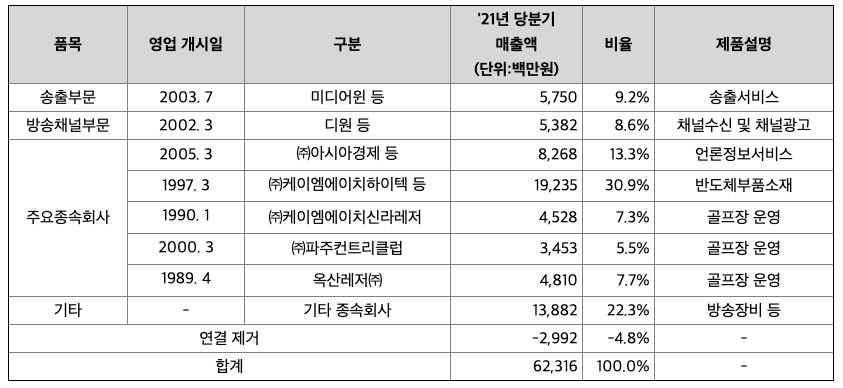 당사의 주력 사업인 방송송출서비스 사업은 방송채널사용사업자의 프로그램을 편성표에 맞게 운행하여 플랫폼 사업자까지 전송하는 별정통신사업이며, 현재 70여개 이상의 채널을 송출하고 있는 국내 최대규모의 사업자입니다. 또한 자체 채널 등으로 PP 사업을 영위하고 있으며, 그 밖에 뉴미디어 변화에 대응할 수 있는 사업확장을 모색하고 있습니다.