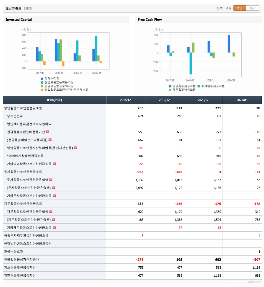 투자활동 현금흐름 : 2018년 -965억원, 2019년 -156억원, 2020년 2억원, 2021년 1분기 -71억원으로 2020년을 제외하고 투자활동 현금흐름이 원활합니다.