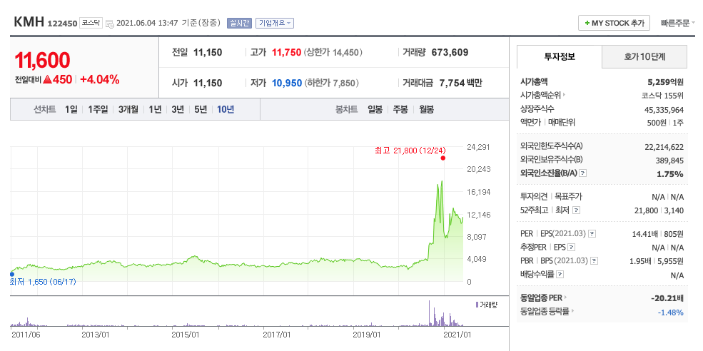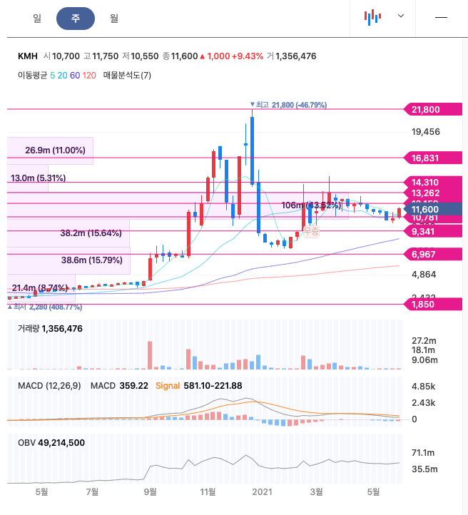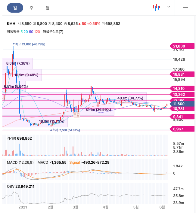 KMH는 20년 9월에 급등하여 급등락을 오가며 20년 12월에 최고점 21,800원을 찍고 급락하였고, 무증이후 보합중에 있습니다.