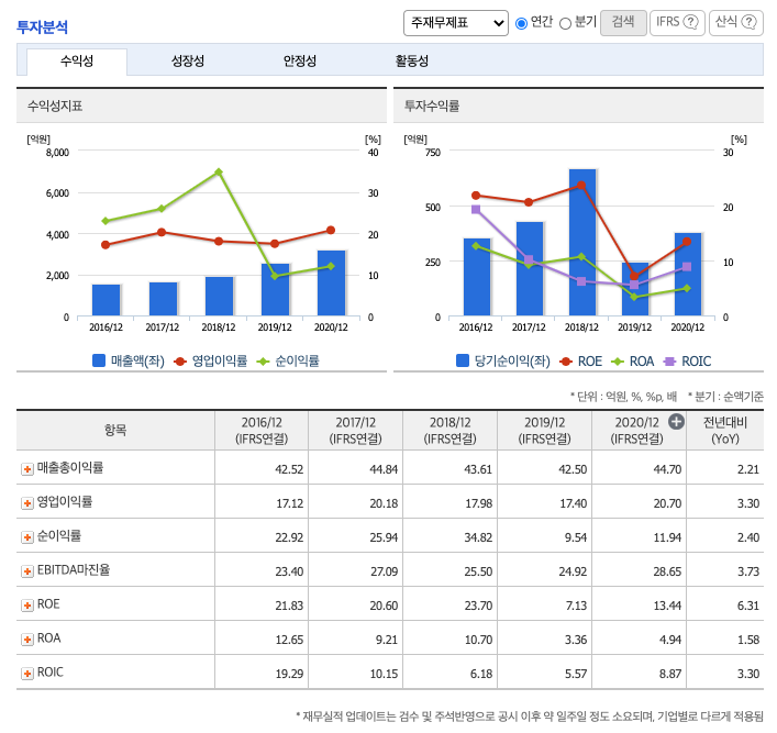 영업이익률 : 2016년 약 17.12%, 2017년 약 20.18%으로 증가, 2018년 약 17.98%, 2019년 약 17.4%으로 감소, 2020년 약 20.7%으로 증가하였습니다.