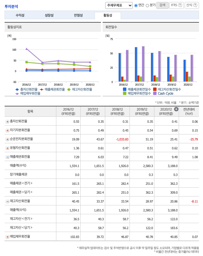 매출채권회전율 : 2018년 약 251억원, 2019년 약 362억원, 2020년 약 309억원이고, 회전율은 2018년 약 7회, 2019년 약 8회, 2020년 약 9회로 안정적입니다.