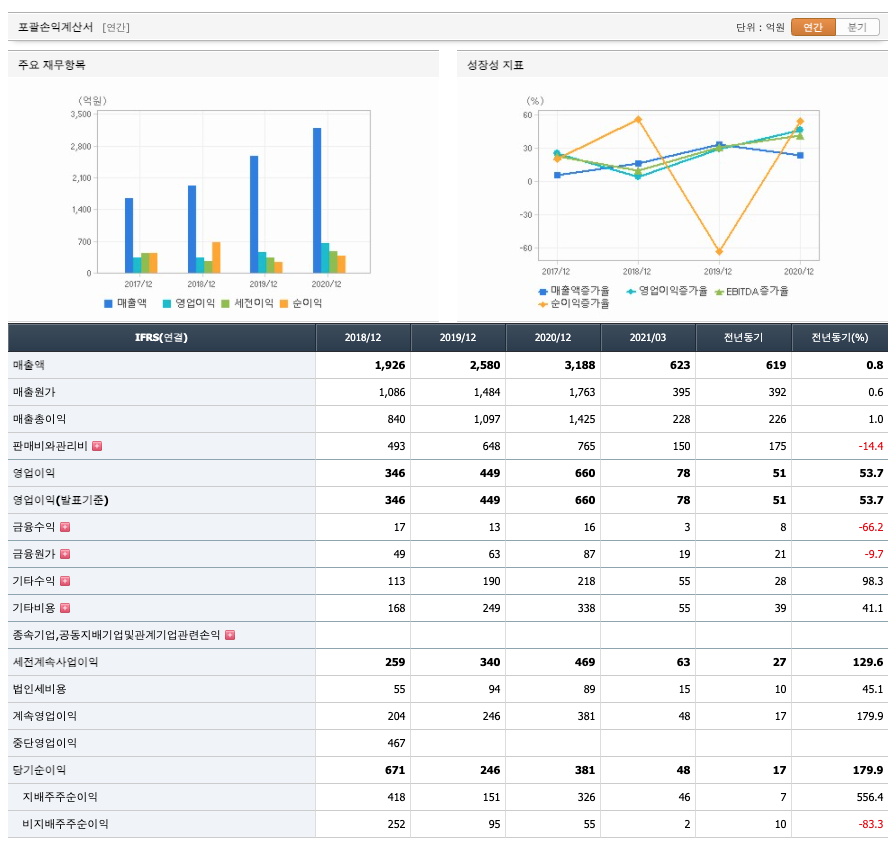 매출액 : 2018년 1926억원, 2019년 2580억원, 2020년 3188억원으로 증가하였고, 2021년 1분기 623억원으로 전년동기대비 증가하였습니다. 2021년 1분기는 전년동기대비 0.8% 증가하였습니다. 2020년 분기별로 보면 2분기 859억원, 3분기 898억원, 4분기 812억원입니다.