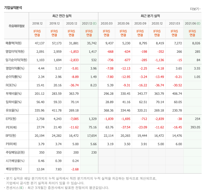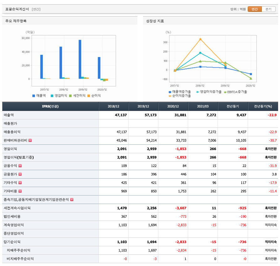 매출액 : 2018년 47,137억원, 2019년 57,173억원으로 증가하였고, 2020년 31,881억원으로 감소하였고, 2021년 1분기 7272억원으로 전년동기대비 감소하였습니다. 2021년 1분기는 전년동기대비 -22.9% 감소하였습니다. 2020년 분기별로 보면 2분기 5230억원, 3분기 8795억원, 4분기 8419억원입니다.