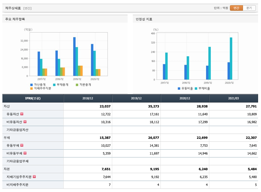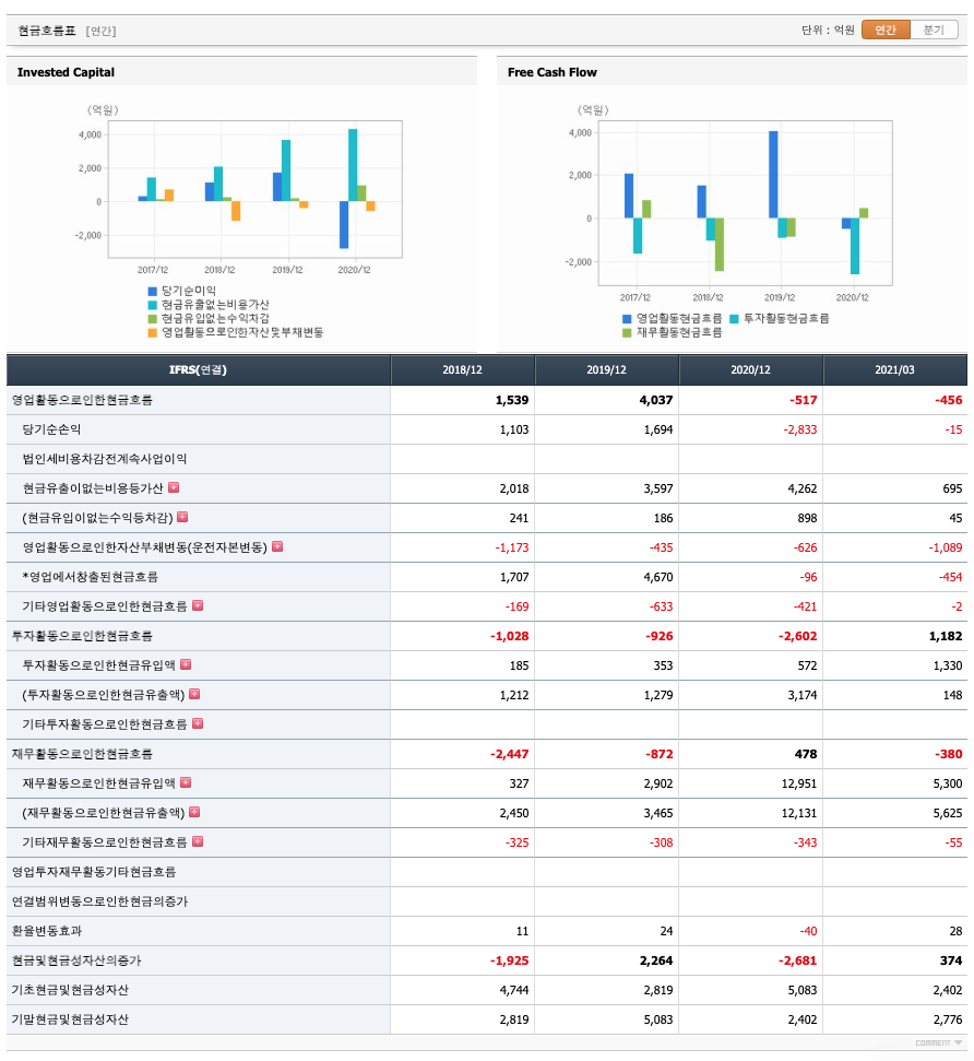 재무활동 현금흐름 : 2018년 -2447억원, 2019년 -872억원, 2020년 478억원, 2021년 1분기 -380억원으로 2020년의 재무활동 현금흐름은 플러스, 2018년과 2019년과 2021년 1분기의 재무활동 현금흐름은 플러스로 원활합니다.