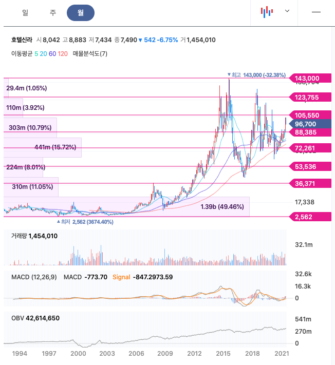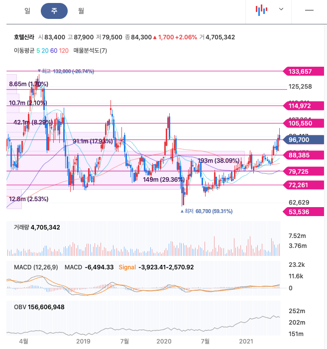 호텔신라는 20년 8월부터 반등을 주었고, 이후 지속적으로 우상향하며, 21년 6월 103,000원을 찍고 조정을 받았습니다.