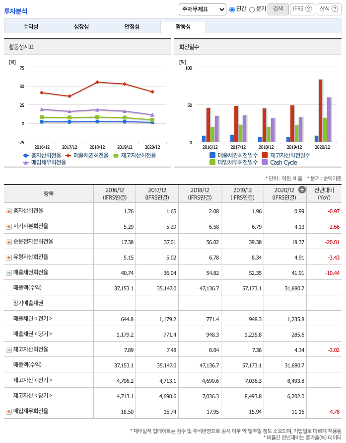 재고자산회전율 : 2018년 약 7036억원, 2019년 약 8493억원, 2020년 약 6202억원이고, 회전율은 2018년 약 8회, 2019년 약 7회, 2020년 약 4회로 안정적입니다.