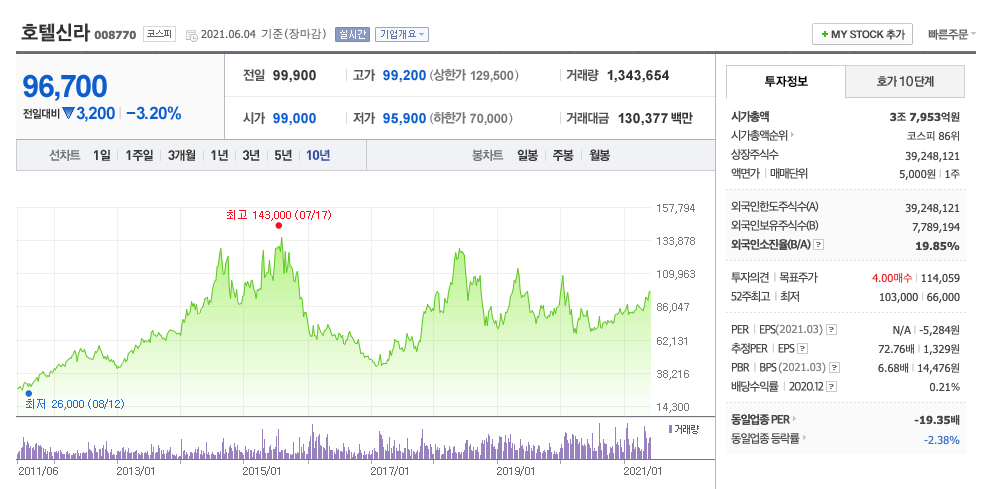 | 호텔신라 | 96,700원 | 89722원 | 91358원 | 90710원 |