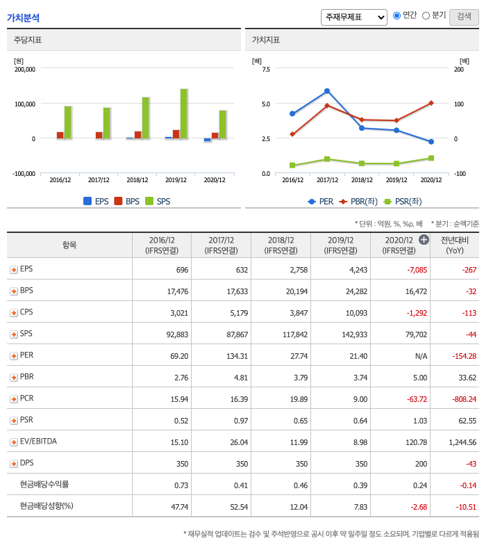 FCF(미래현금흐름) : 2018년 761억원, 2019년 3379억원, 2020년 -994억원으로 2018년과 2019년의 미래현금흐름이 좋았으나 2020년의 미래현금흐름은 그렇지 않습니다. 2021년은 667억원으로 추정됩니다.