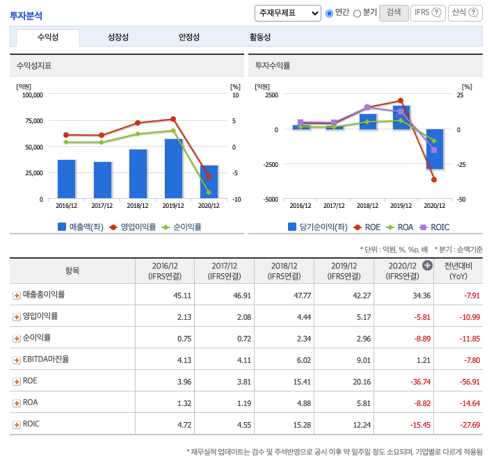 영업이익률 : 2016년 약 2.13%, 2017년 약 2.08%으로 감소, 2018년 약 4.44%로 증가, 2019년 약 5.17%로 증가, 2020년 약 -5.81%로 감소하였습니다.