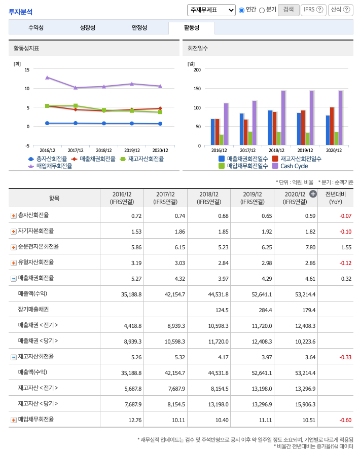매출채권회전율 : 2018년 약 11,720억원, 2019년 약 12,408억원, 2020년 약 10,223억원이고, 회전율은 2018년 약 3회, 2019년 약 4회, 2020년 약 4회로 안정적입니다.