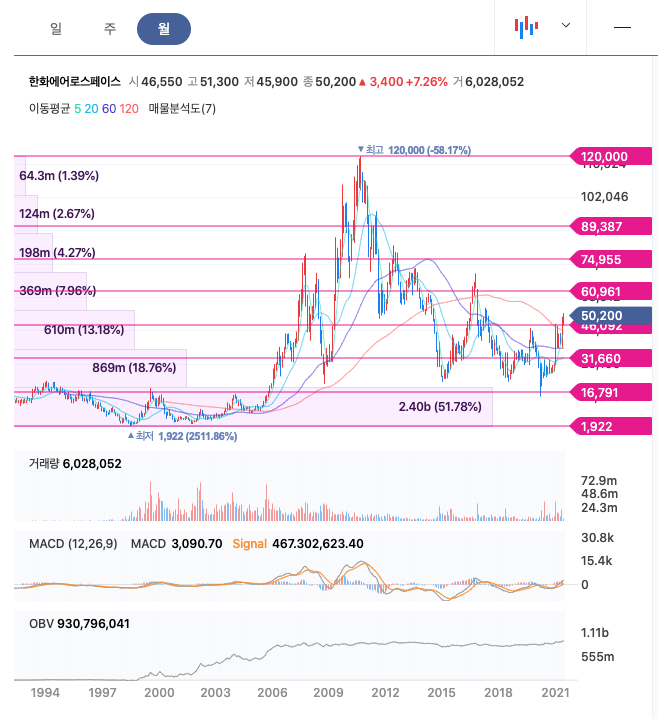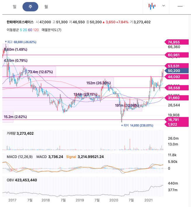 한화에어로스페이스는 21년 1월부터 주가가 반등하였고, 2~4월까지 조정 및 횡보를 하였지만, 5월부터 반등하여 21년 6월에 최곡 51,300원을 찍었습니다.