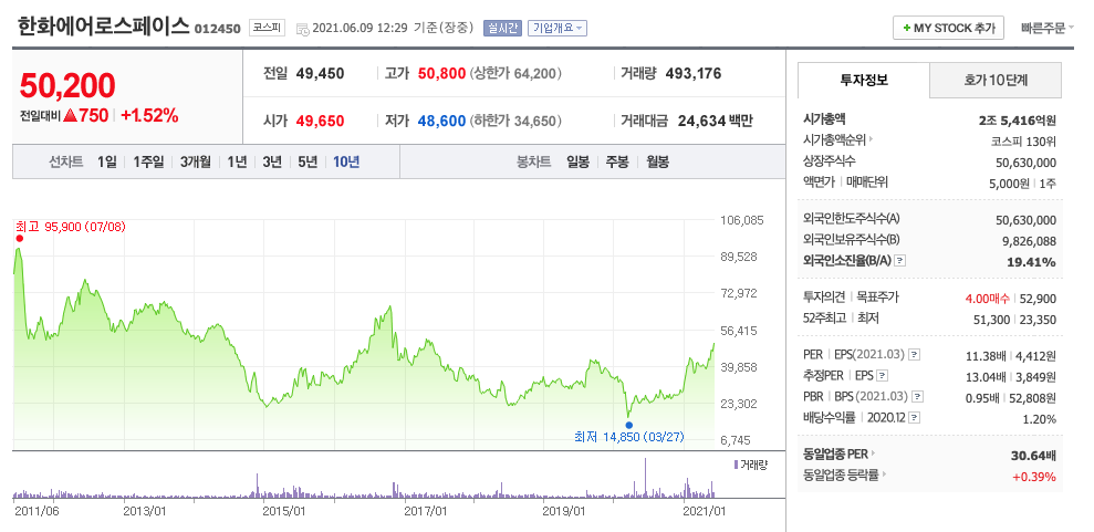 | 한화에어로스페이스 | 49,950원 | 43568원 | 43233원 | 43006원 |