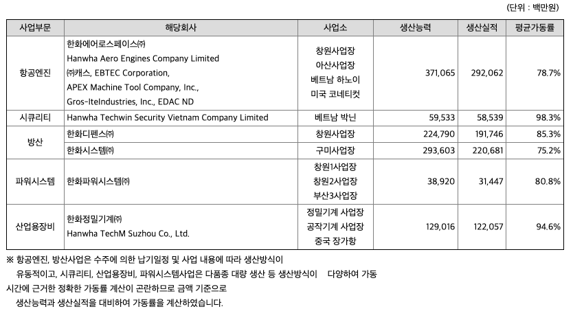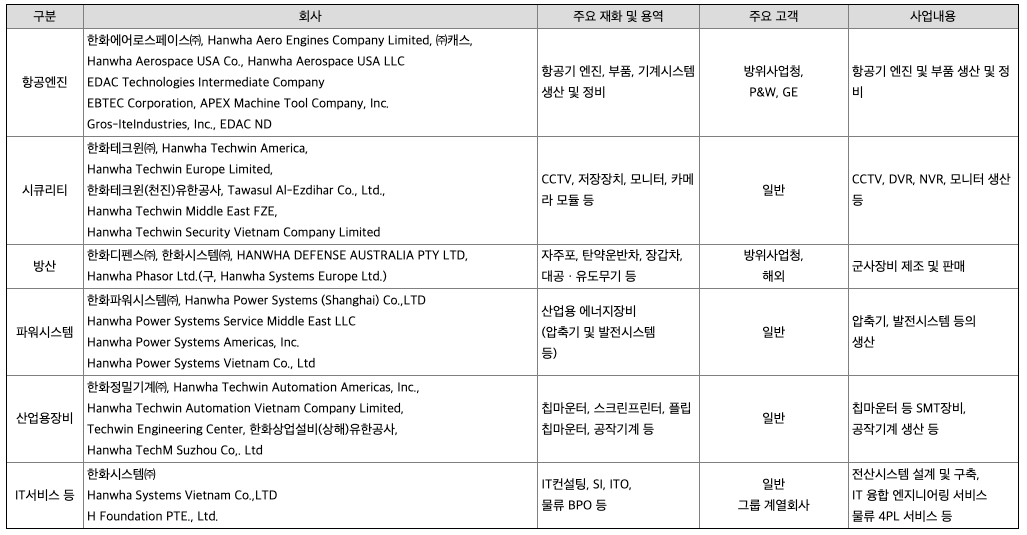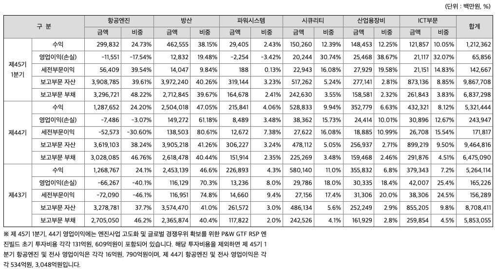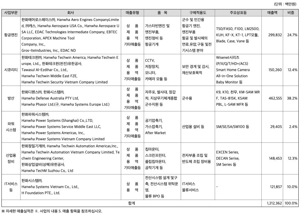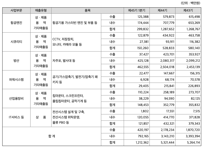 당사는 수익을 창출하는 재화와 용역의 성격, 이익 창출단위, 제품 및 제조공정의 특징, 시장 및 판매방법의 특징, 사업부문 구분의 계속성 등을 고려하여 경영의 다각화 실태를 적절히 반영할 수 있도록 항공엔진, 시큐리티, 방산, 파워시스템, 산업용장비, IT서비스 사업을 구분하고 있습니다.당사 및 종속회사의 사업부문별 현황을 요약하면 아래와 같습니다.