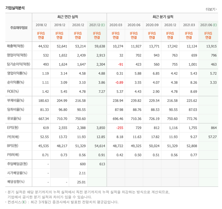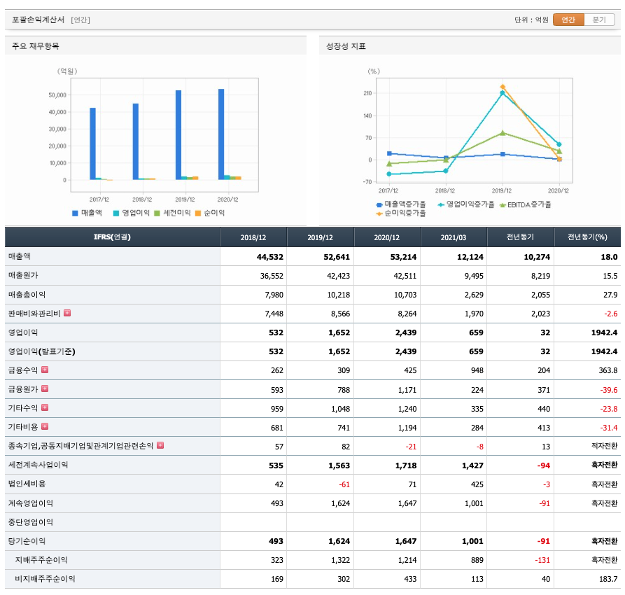매출액 : 2018년 44,532억원, 2019년 52,641억원, 2020년 53,214억원으로 증가하였고, 2021년 1분기 12,124억원으로 전년동기대비 증가하였습니다. 2021년 1분기는 전년동기대비 18% 증가하였습니다. 2020년 분기별로 보면 2분기 11,927억원, 3분기 13,771억원, 4분기 17,242억원입니다.