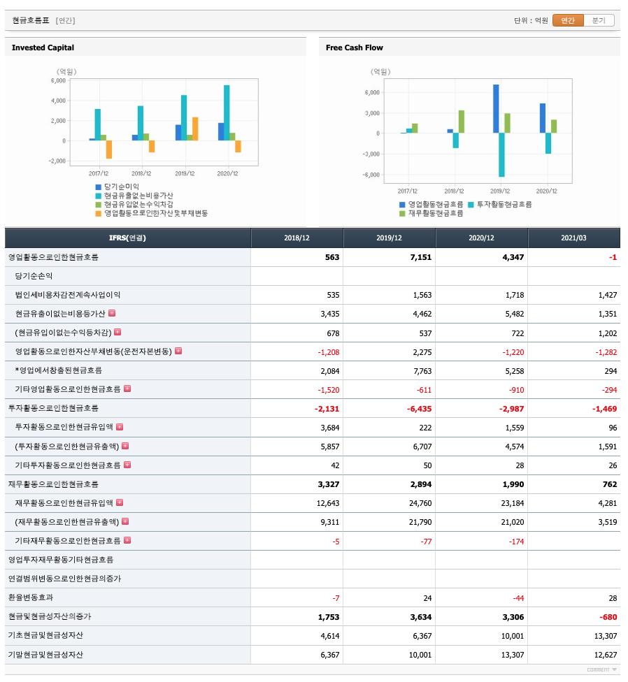 영업활동 현금흐름 : 2018년 563억원, 2019년 7151억원, 2020년 4347억원, 2021년 1분기 -1억원으로 2018년~2020년의 영업활동 현금흐름은 원활합니다.