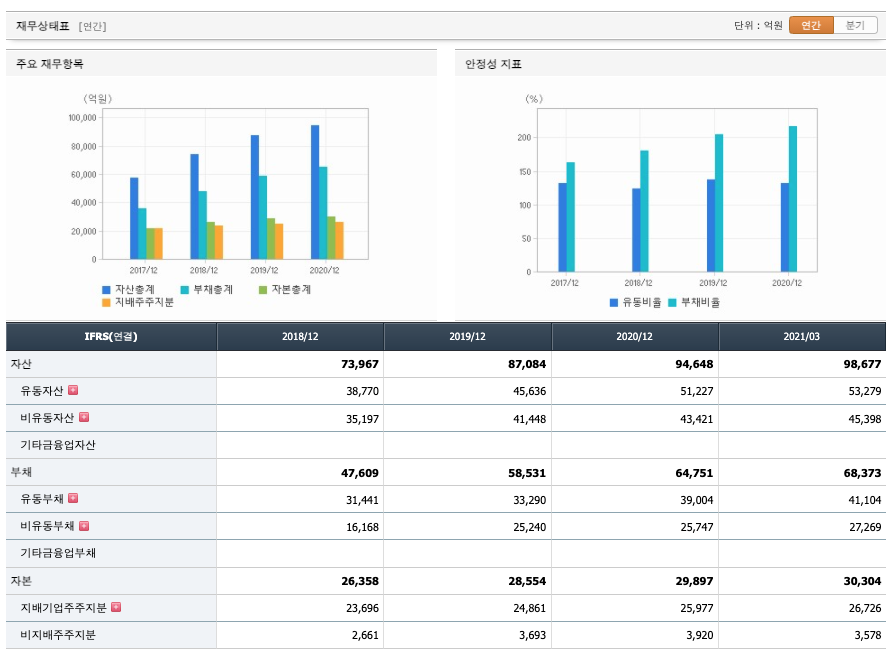 재무활동 현금흐름 : 2018년 3327억원, 2019년 2894억원, 2020년 1990억원, 2021년 1분기 762억원으로 재무활동 현금흐름이 플러스로 원활합니다.