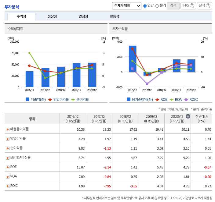 영업이익률 : 2016년 약 4.28%, 2017년 약 1.97%, 2018년 약 1.19%, 2019년 약 3.14%, 2020년 약 4.58%으로 증가하였습니다.