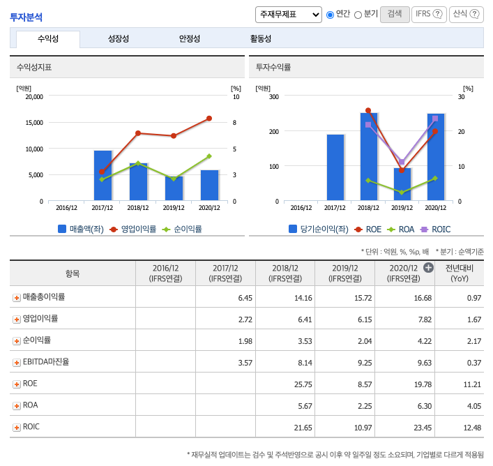 영업이익 : 2018년 458억원, 2019년 284억원으로 감소, 2020년 463억원으로 증가, 2020년 1분기 122억원으로 전년동기대비 증가하였습니다. 2021년 1분기는 전년동기대비 53.6% 증가하였습니다. 2020년 분기별로 보면 2분기 88억원, 3분기 171억원, 4분기 125억원입니다.