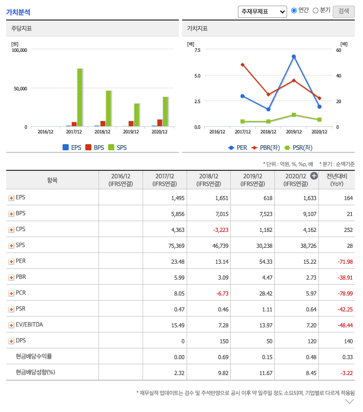 FCF(미래현금흐름) : 2018년 -573억원, 2019년 167억원, 2020년 619억원으로 2019년부터 미래현금흐름이 좋습니다. 2021년은 292억원으로 추정됩니다.